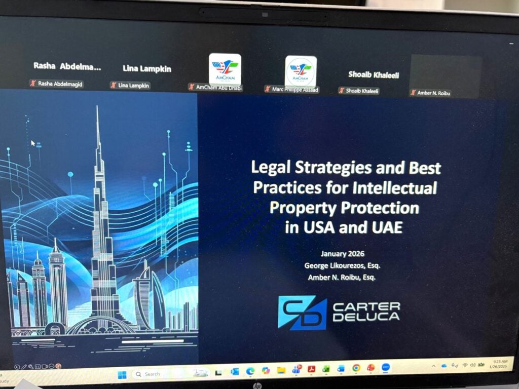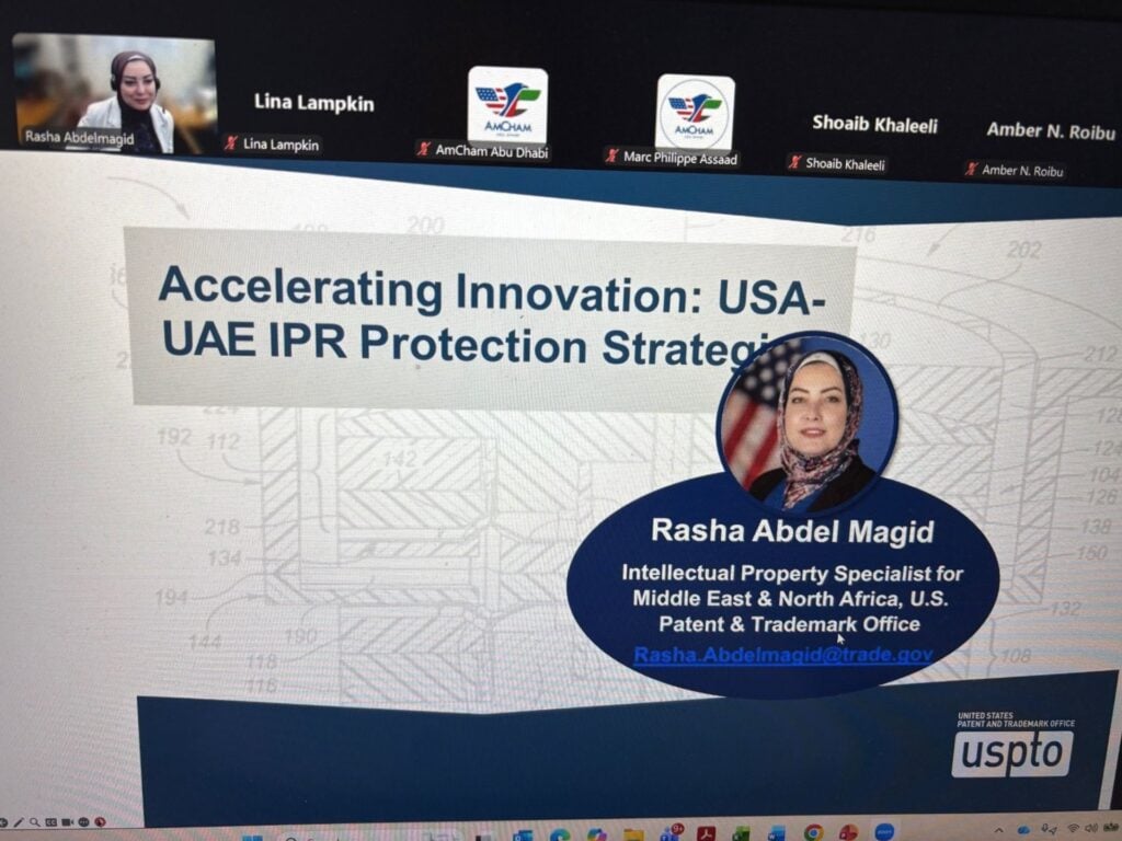 AmCham Abu Dhabi, through its Legal Affairs Committee, convened a webinar in partnership with the U.S. Commercial Service, the United States Patent and Trademark Office, and Carter, DeLuca & Farrell LLP, bringing together U.S. legal and policy expertise to examine intellectual property (IP) protection across the United States and the United Arab Emirates.