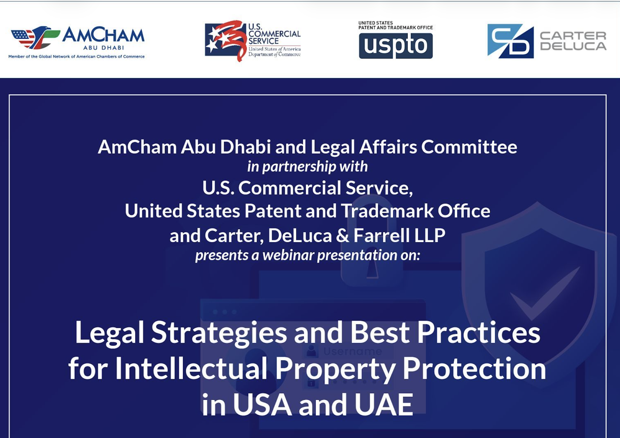 AmCham Abu Dhabi, through its Legal Affairs Committee, convened a webinar in partnership with the U.S. Commercial Service, the United States Patent and Trademark Office, and Carter, DeLuca & Farrell LLP, bringing together U.S. legal and policy expertise to examine intellectual property (IP) protection across the United States and the United Arab Emirates.